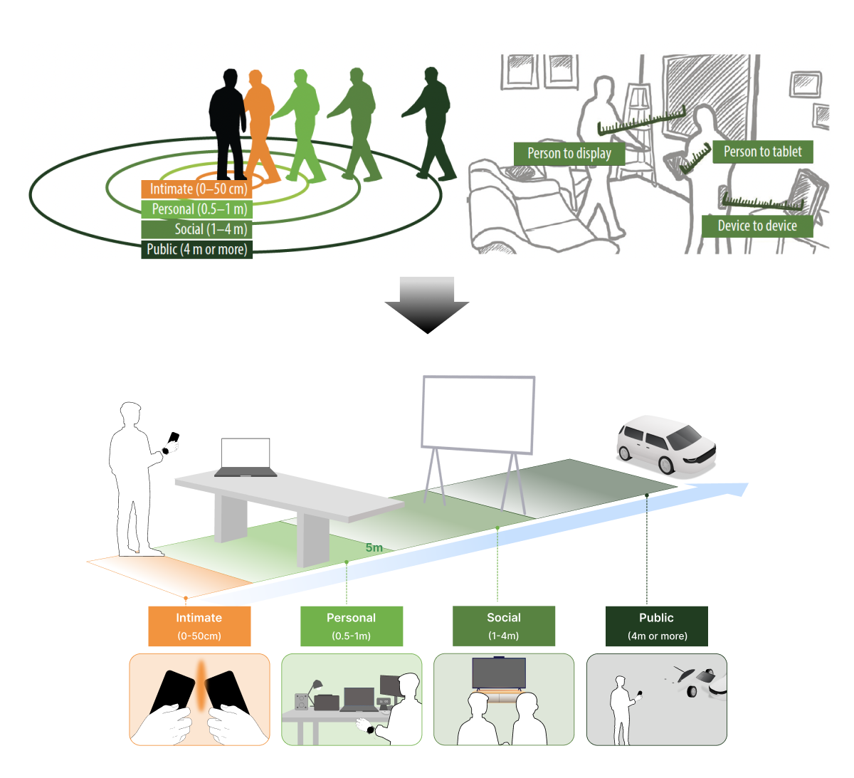 Device interactions, as well as those between people and devices, should seamlessly adjust to variations in distance.